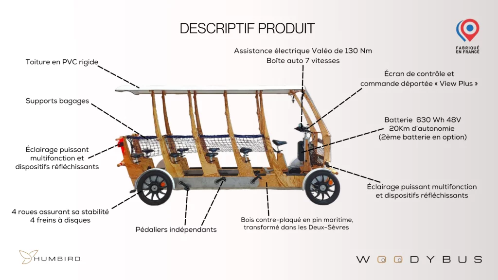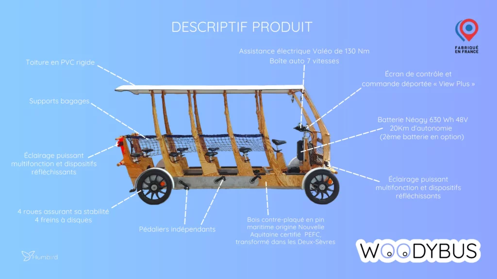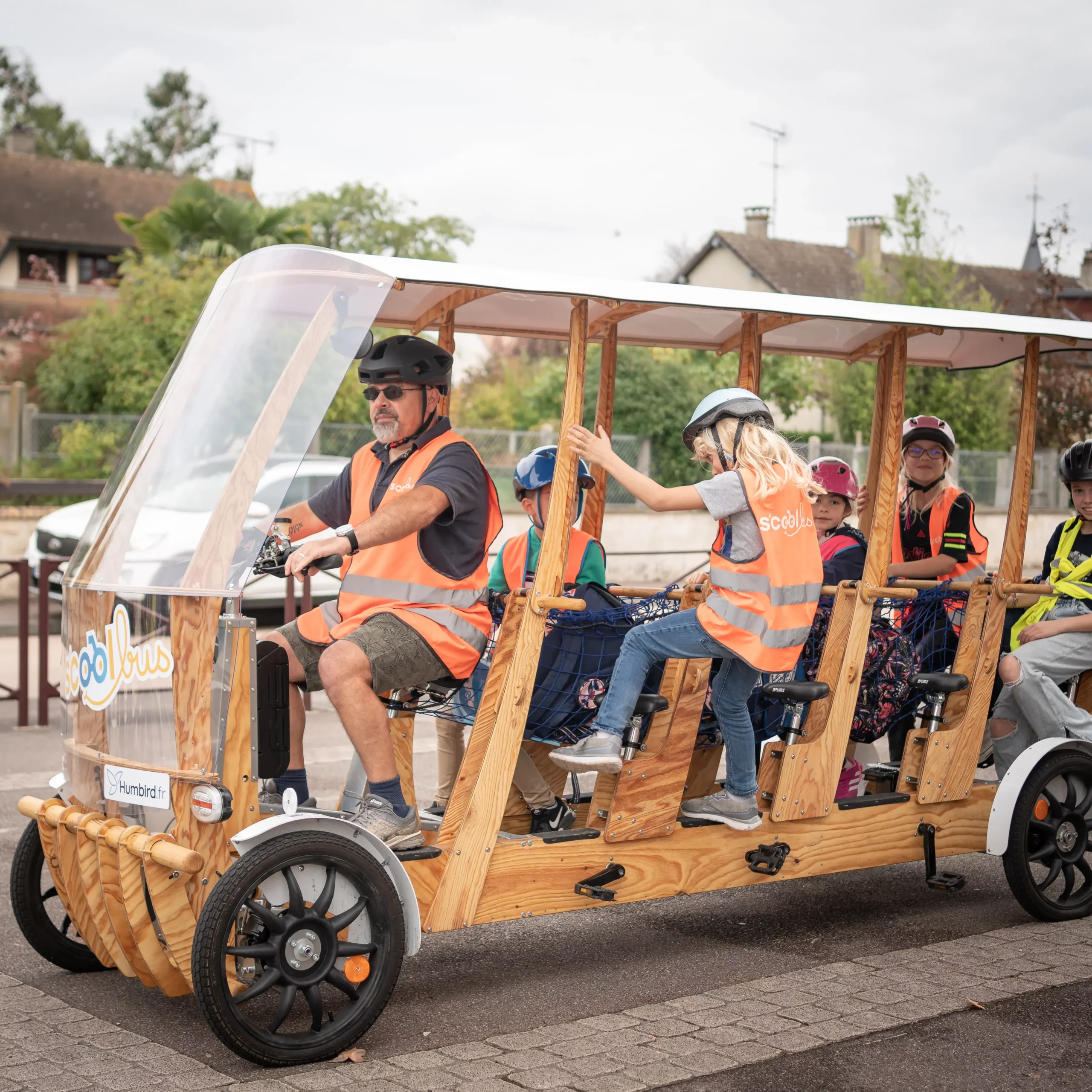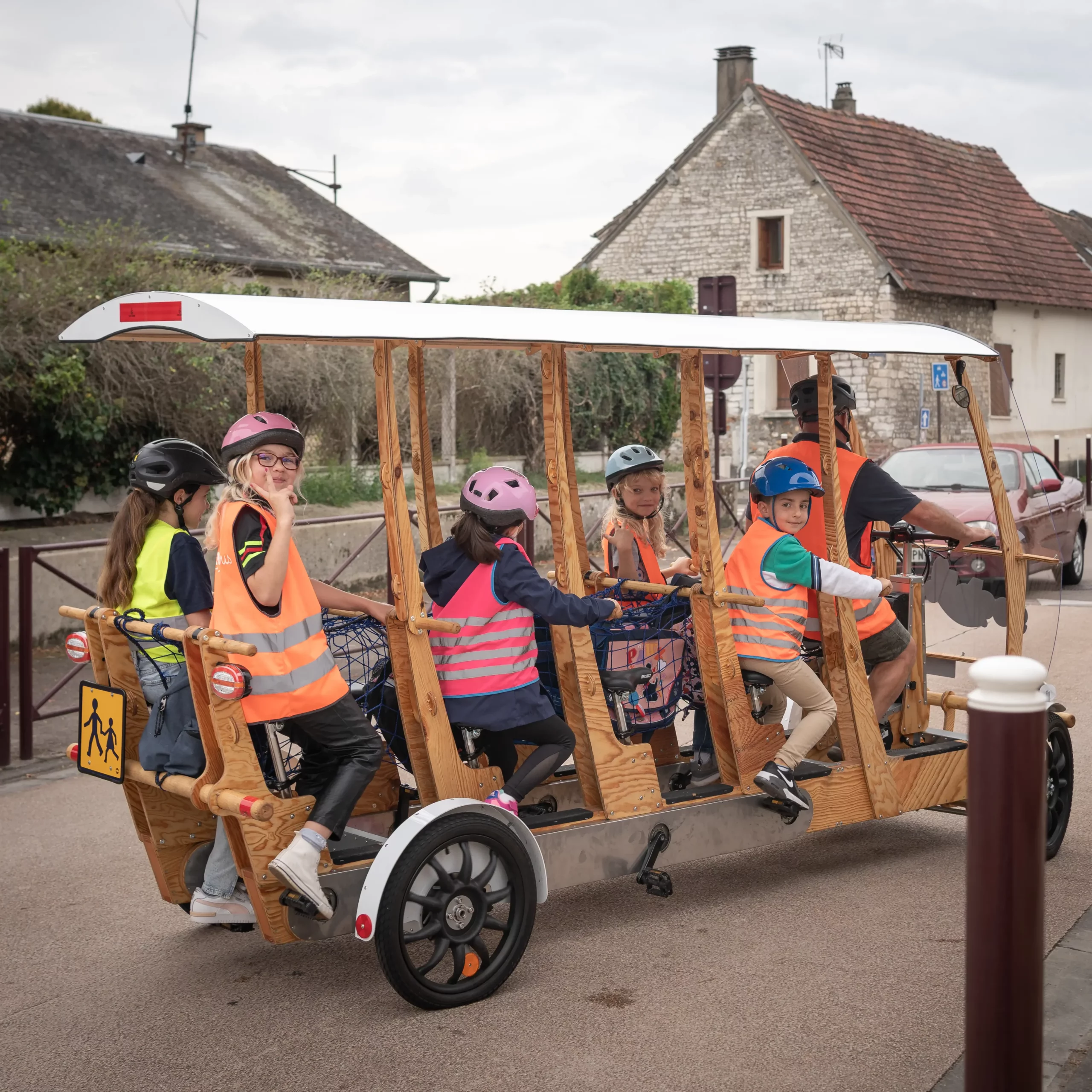 Woodybus est un quadricycle à assistance électrique. A son bord, 8 enfants et 1 adulte prennent place.