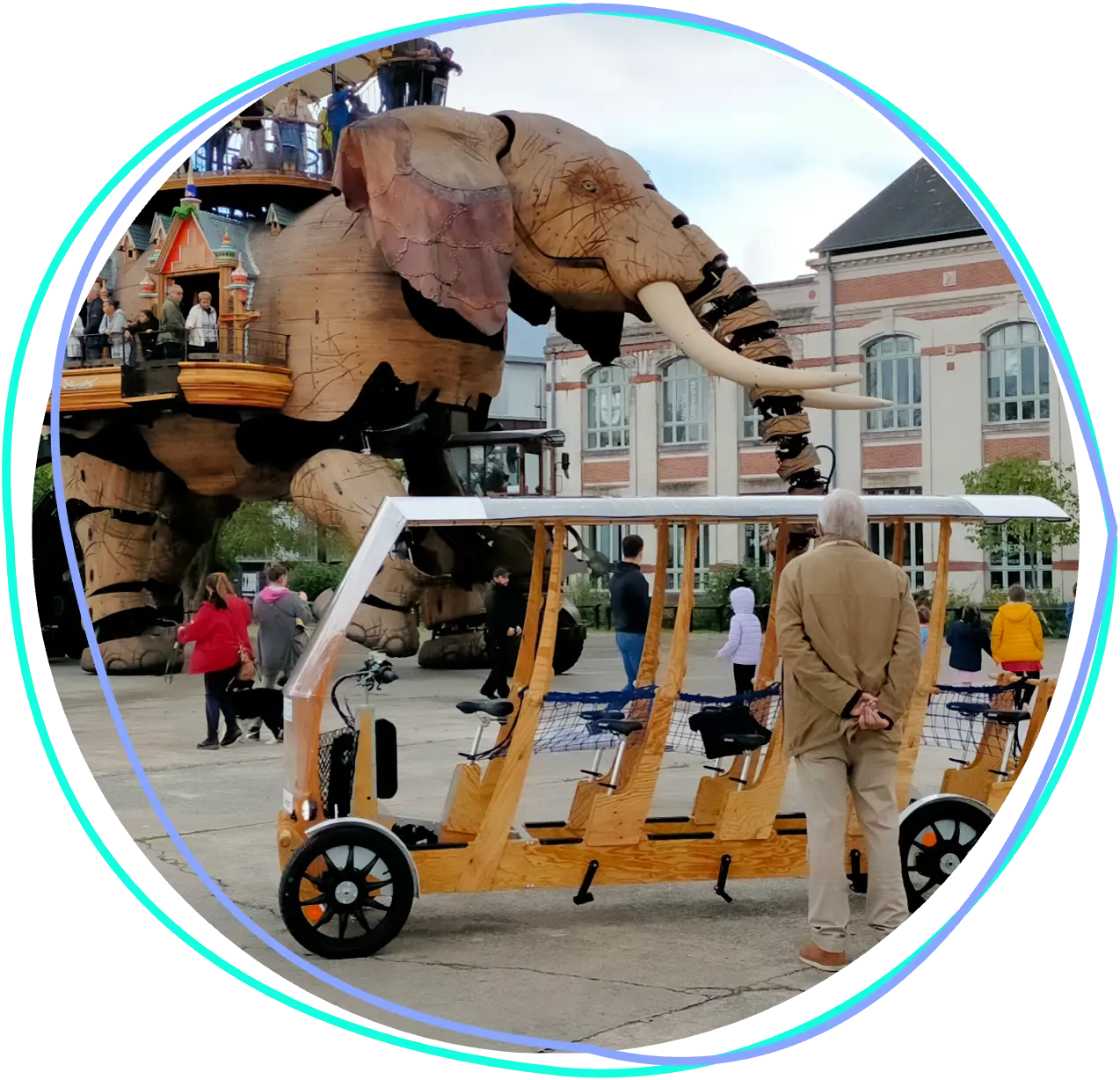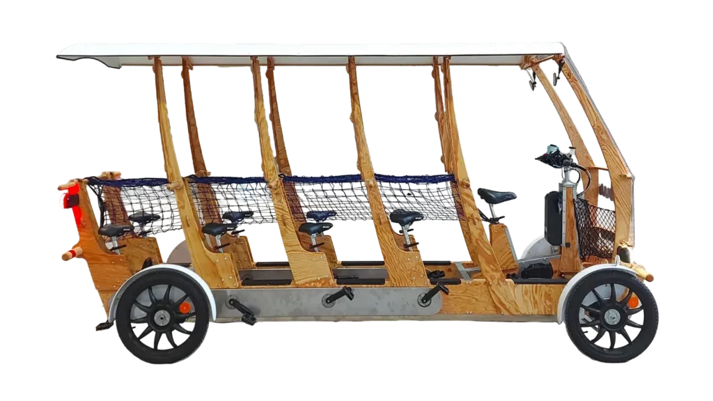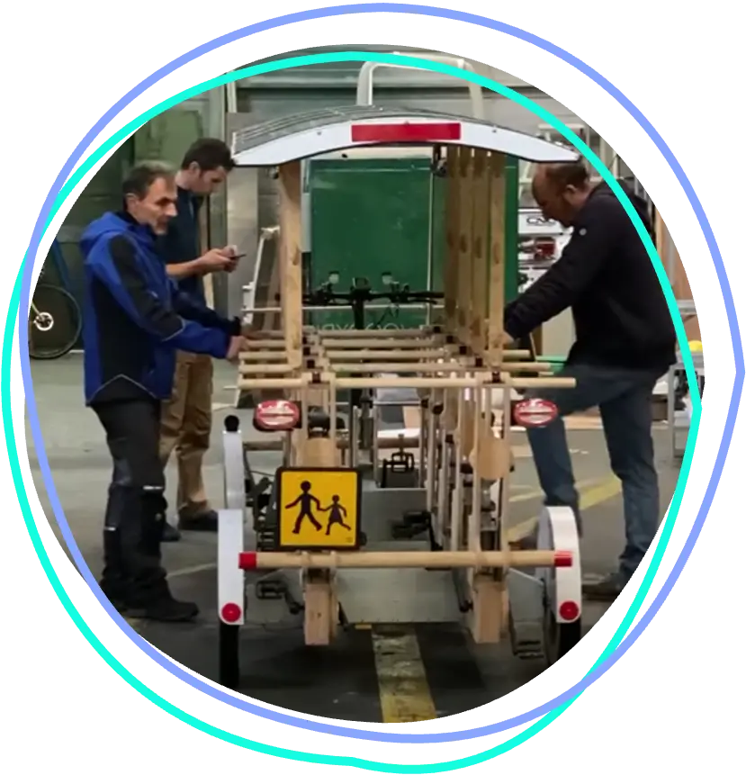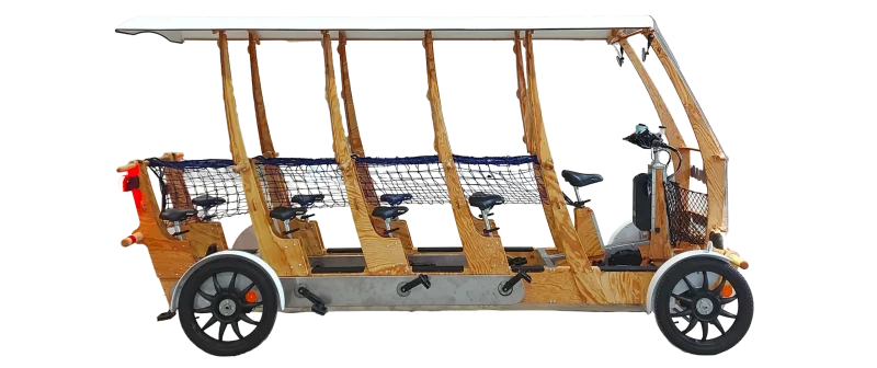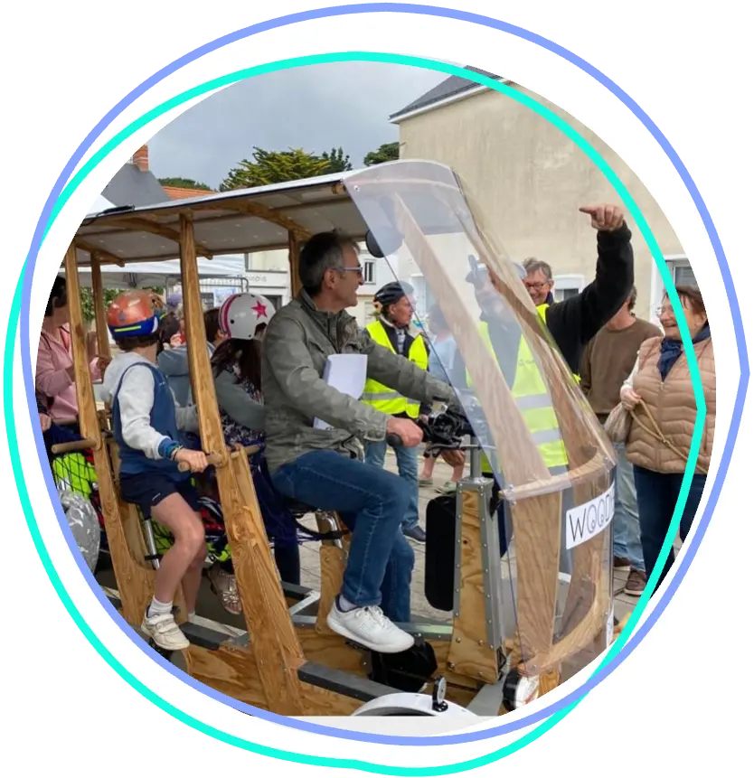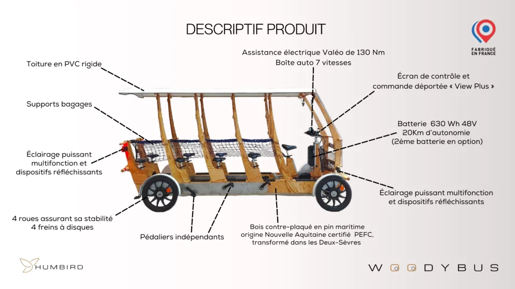 Woodybus est un quadricycle à assistance électrique. A son bord, 8 enfants et 1 adulte prennent place.