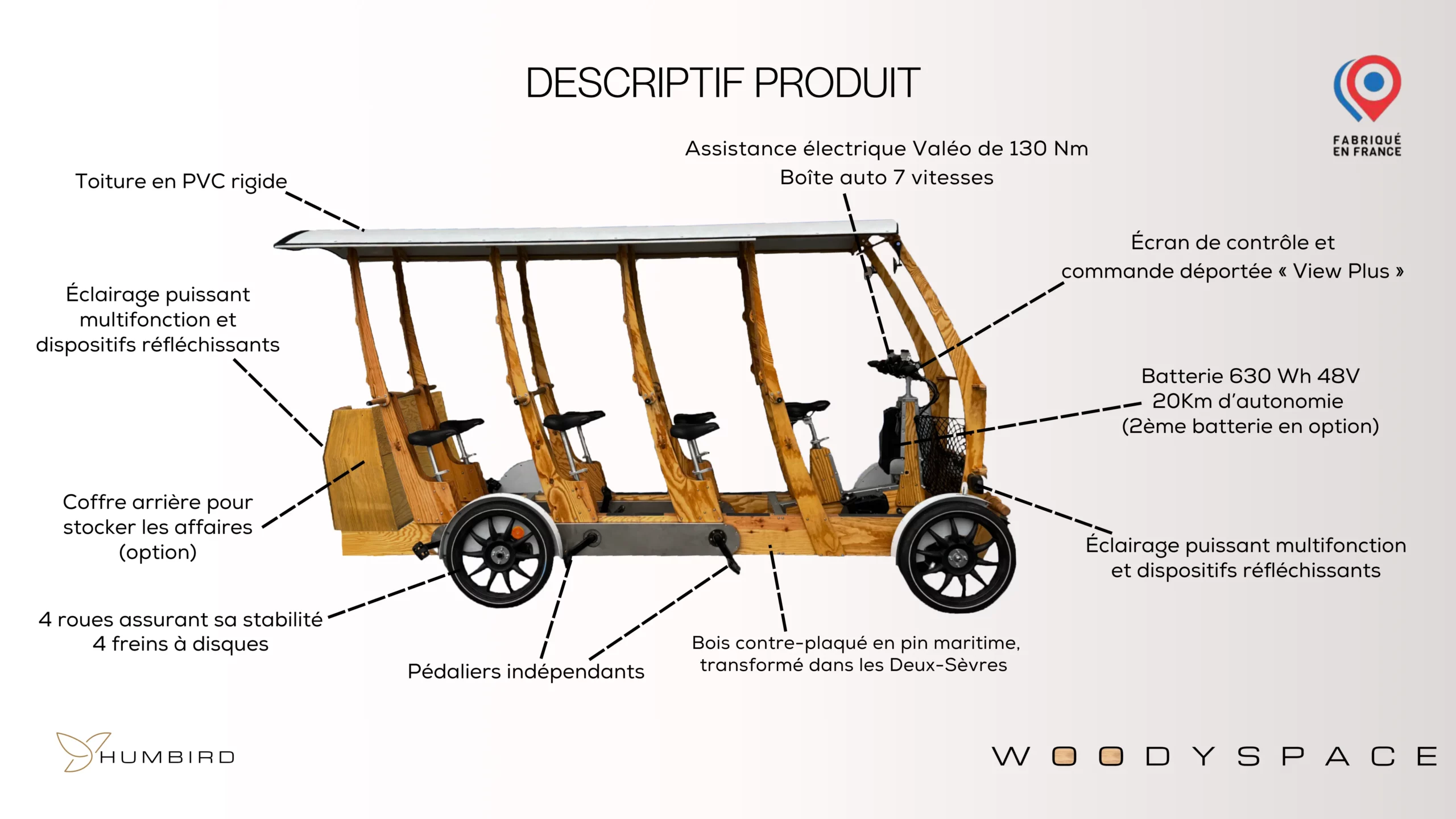 Le Woodyspace est un quadricycle à assistance électrique. A son bord, 1 chauffeur, 4 adultes et 2 enfants pouvant pédaler prennent place.