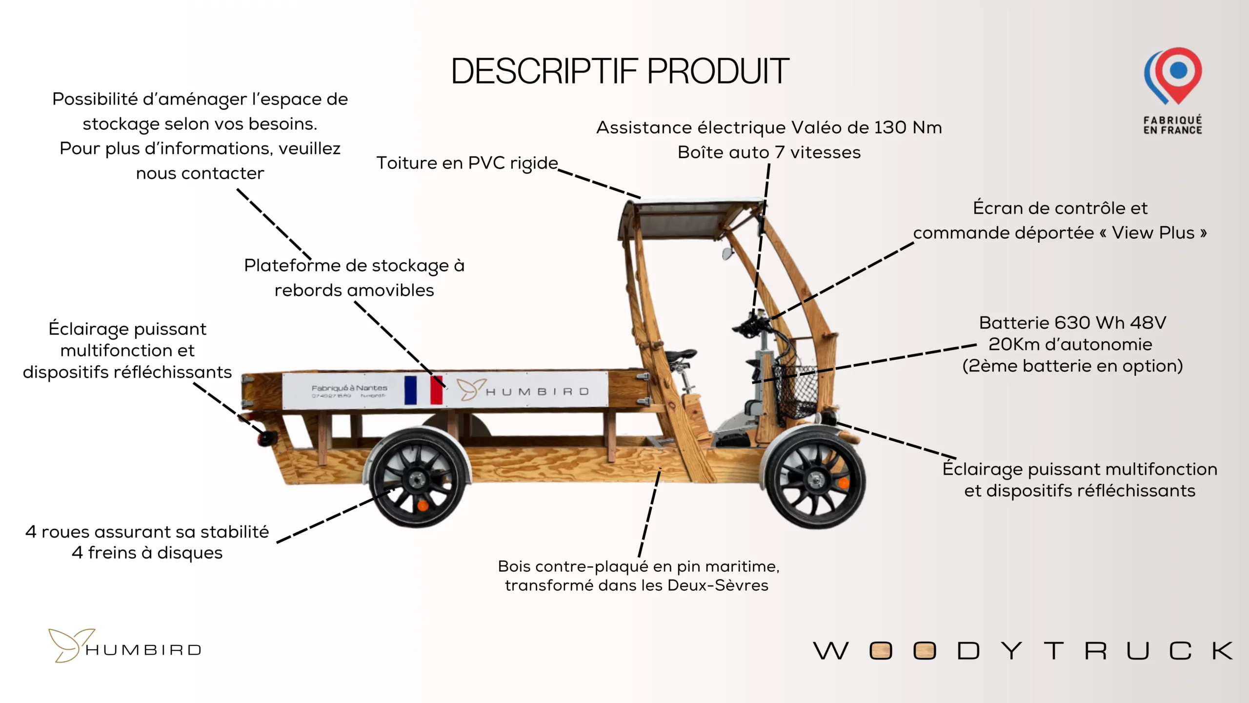 Le Woodytruck est un quadricycle à assistance électrique. Selon le terrain, il peut transporter jusqu’à 200kg de charge en plus du chauffeur.